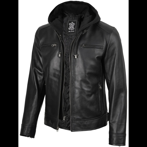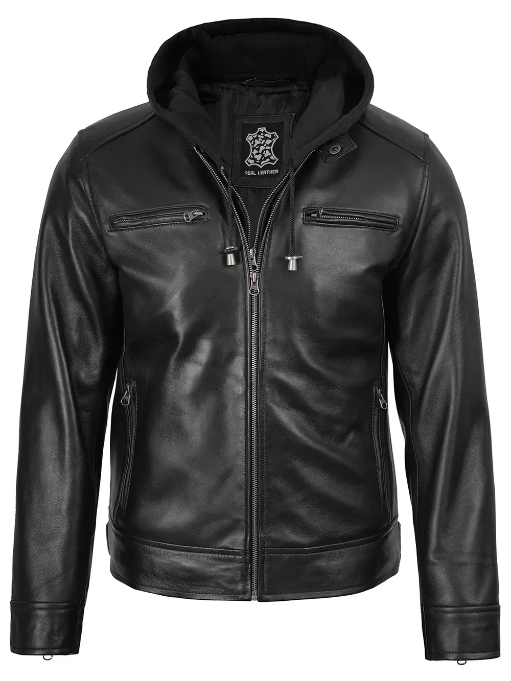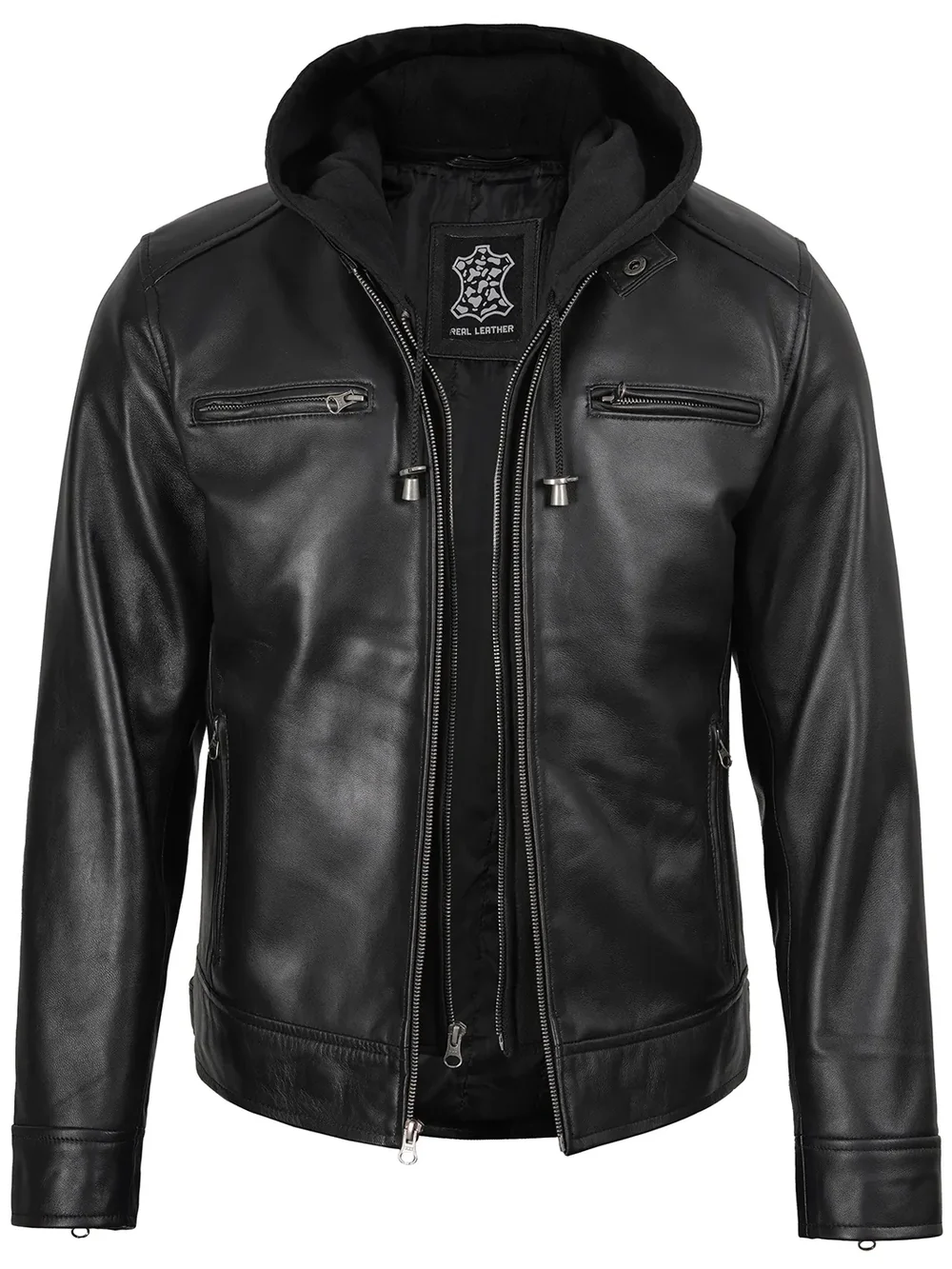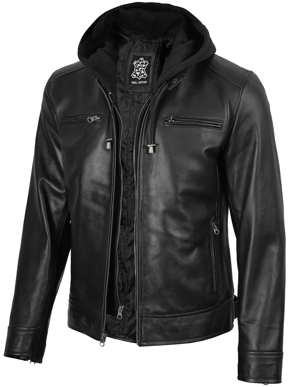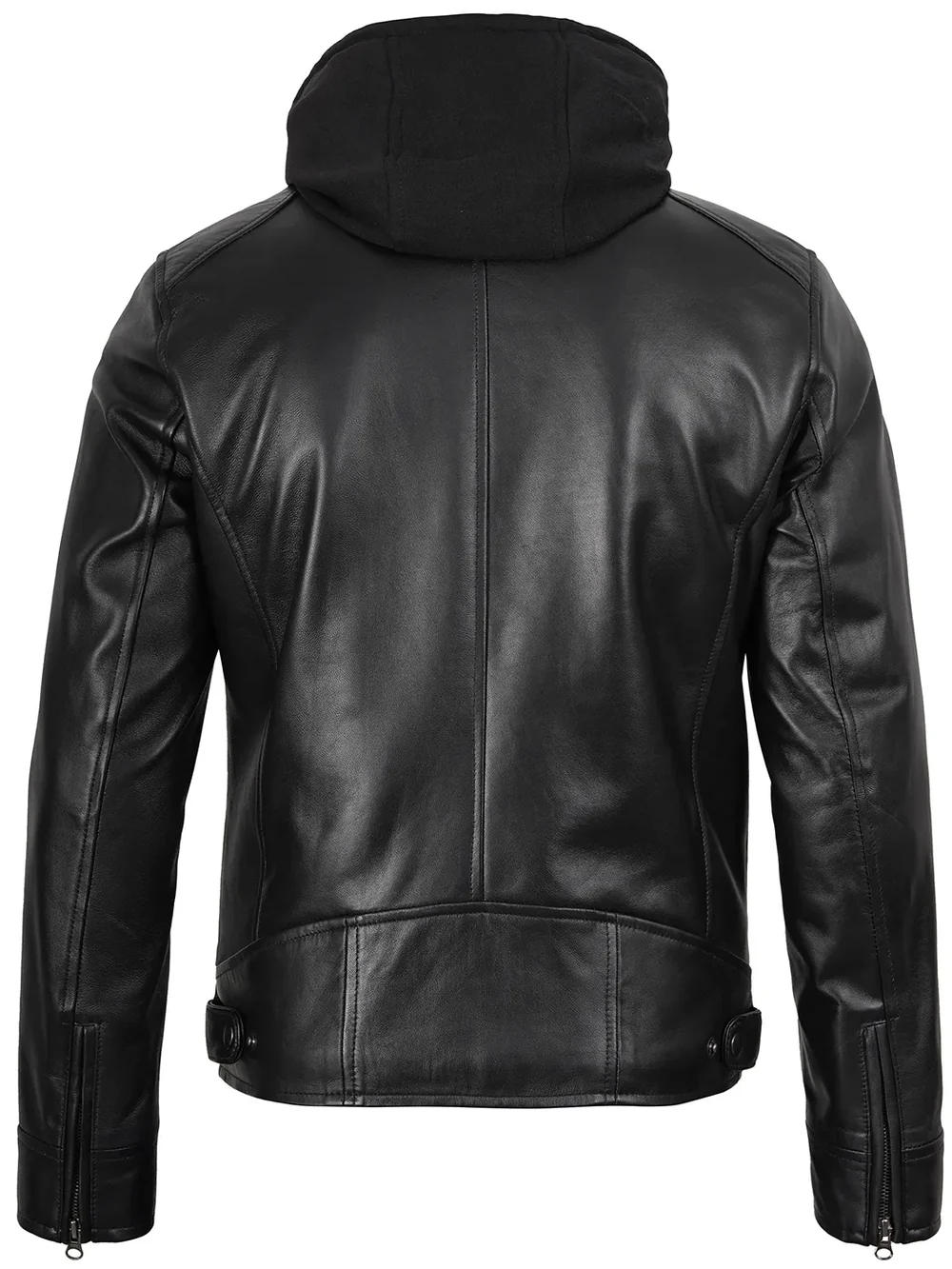 Elite Biker Jacket – Detachable Hood Black Lambskin Moto Leather Jacket
