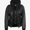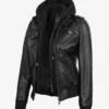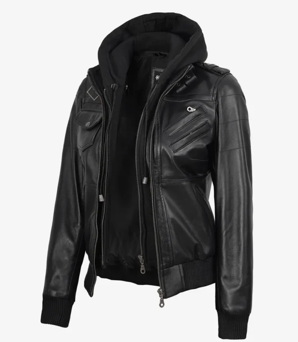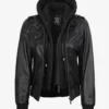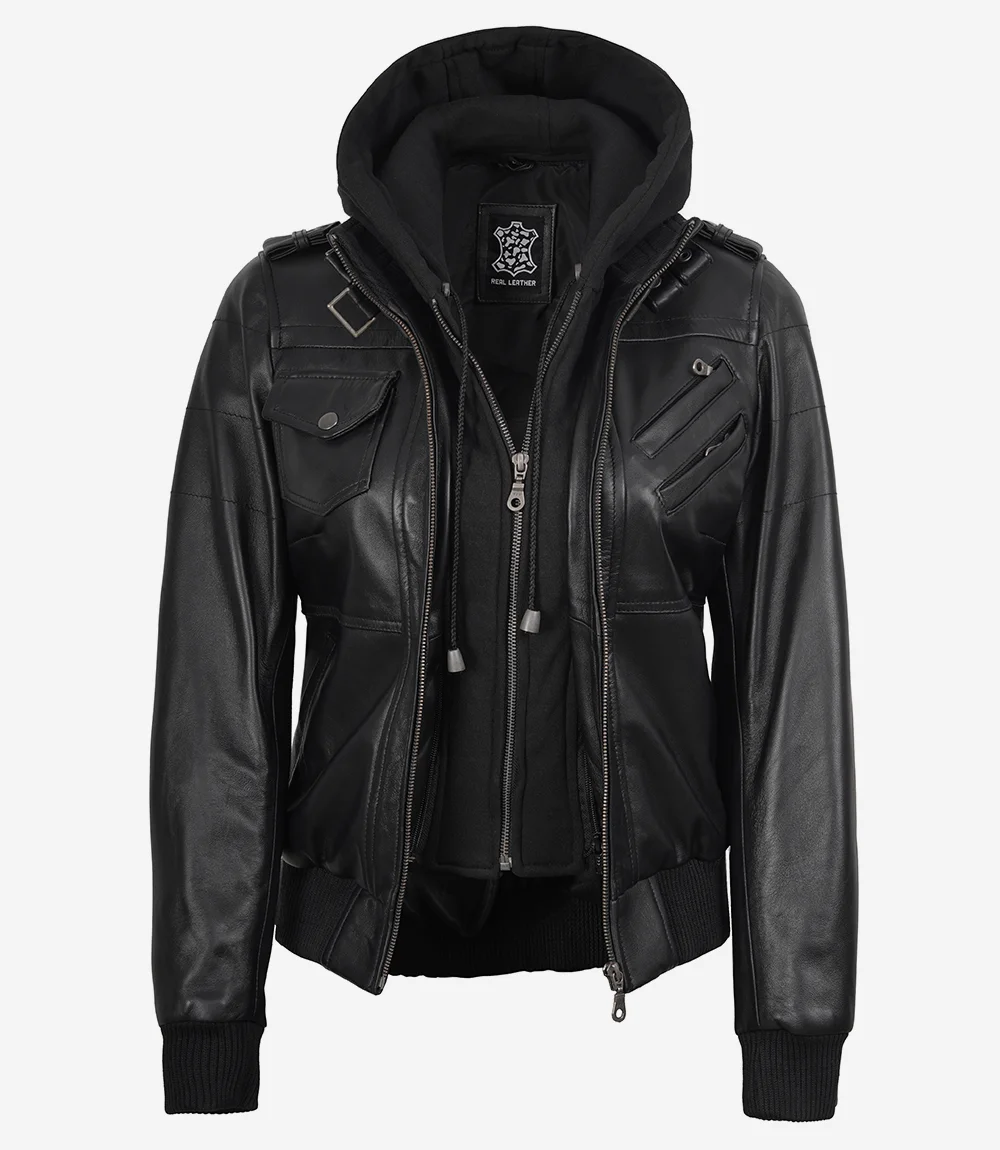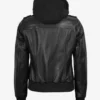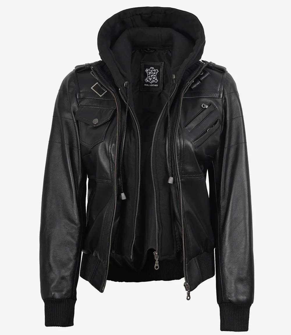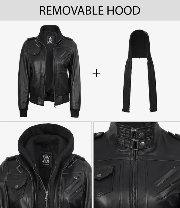 Edinburgh Women’s Bomber Black Leather Jacket with Removable Hood