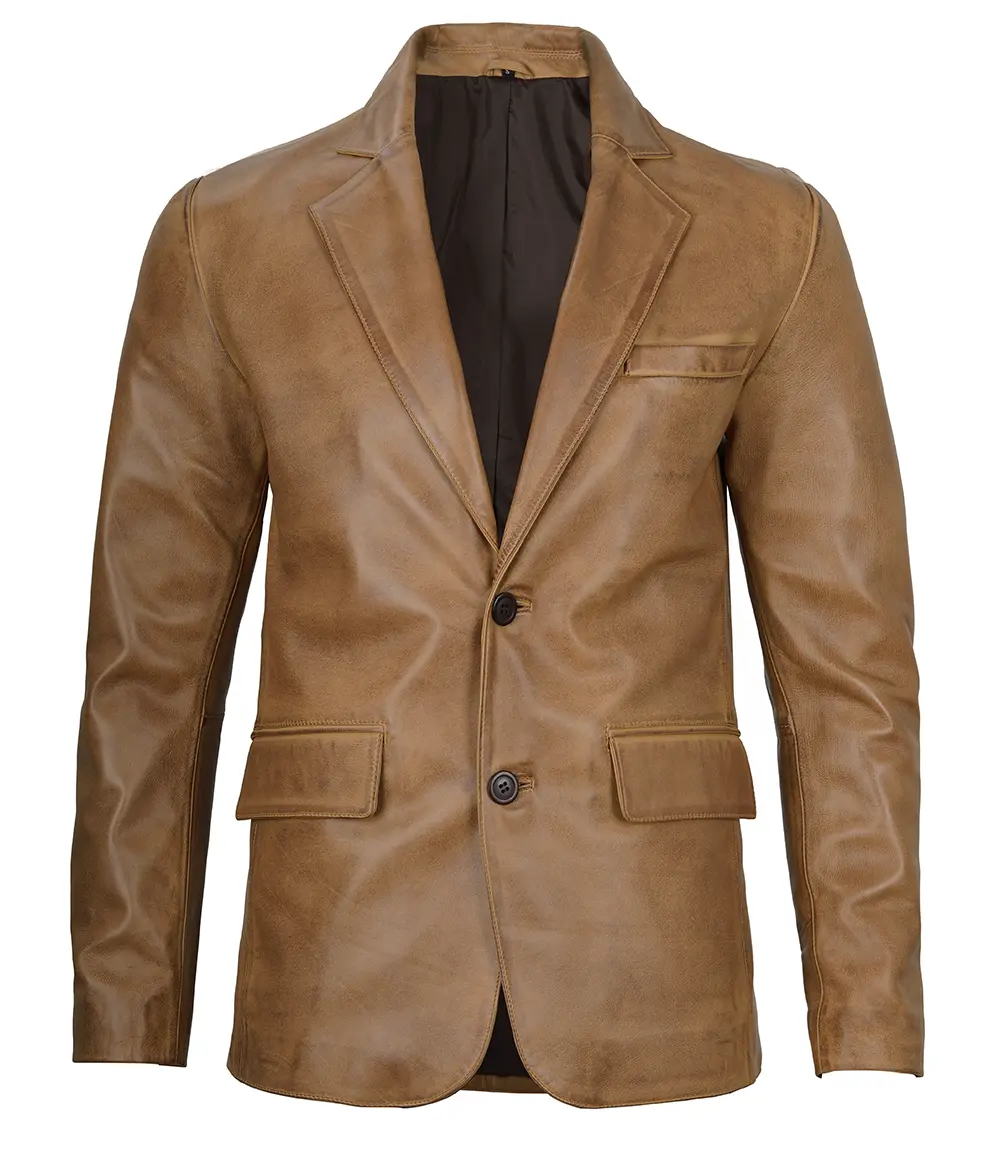 Men’s Camel Brown Leather Blazer Two Button Jacket