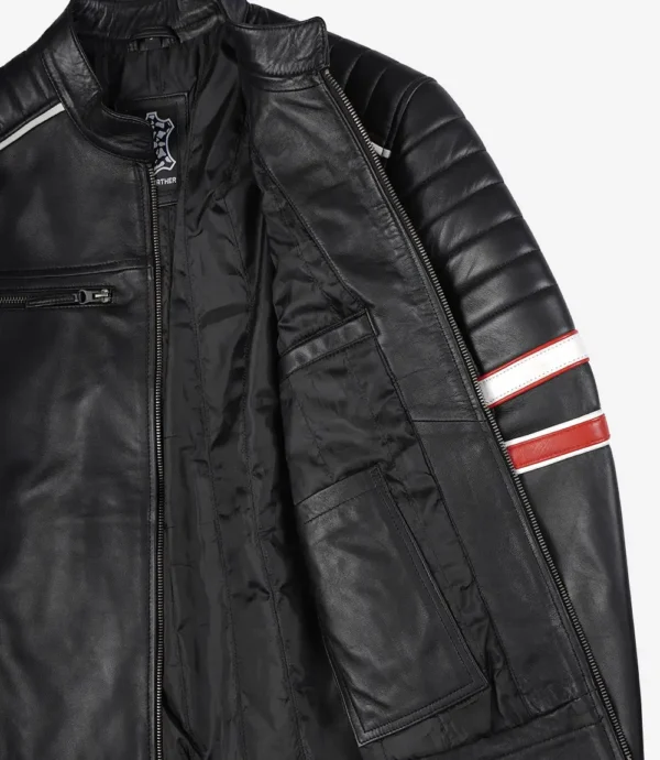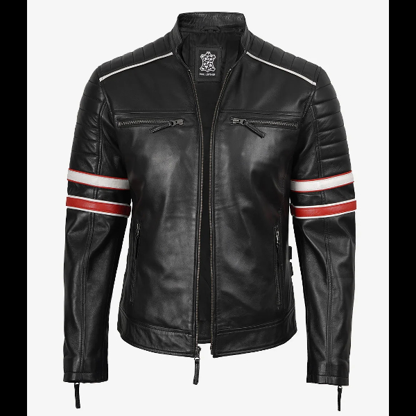 Stand out on the road with the Black Dual‑Stripe Café Racer Leather Jacket from Elite Biker Jacket. This striking piece features bold dual racing stripes along both sleeves, a mandarin collar, padded shoulders, and multiple zippered pockets for both style and utility. Crafted from genuine lambskin leather with a sleek matte finish, the jacket offers a streamlined silhouette that doesn’t bulk. The smooth inner lining ensures comfort whether you’re riding or walking the streets. With vintage flair and modern detailing, this jacket fuses biker edge and everyday wearability.