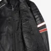 It includes dual racing stripes on sleeves, padded shoulders, zippered pockets, and a mandarin collar for a sleek biker aesthetic. -