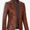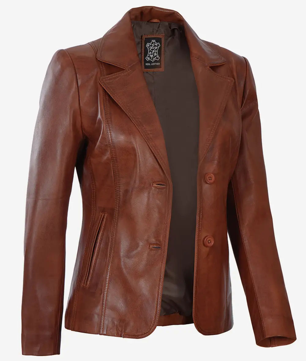 Elite Biker Jacket — Chic Cognac Brown Lambskin Two-Button Leather Blazer Jacket.Redefine elegance with the Chic Cognac Brown Lambskin Two-Button Leather Blazer Jacket from Elite Biker Jacket. Crafted from premium lambskin leather in a sophisticated cognac hue, this blazer merges timeless class with modern flair. The two-button front, structured tailoring, and smooth lining ensure a flattering fit and luxurious comfort. Whether styled for business meetings, date nights, or casual sophistication, this piece radiates confidence and charm. Designed for women who value both finesse and function, the blazer from Elite Biker Jacket brings effortless refinement to your wardrobe while celebrating bold, lasting style.